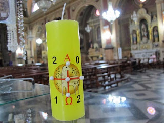 Vela com símbolos religiosos e letras gregas é abençoada no sábado santo.